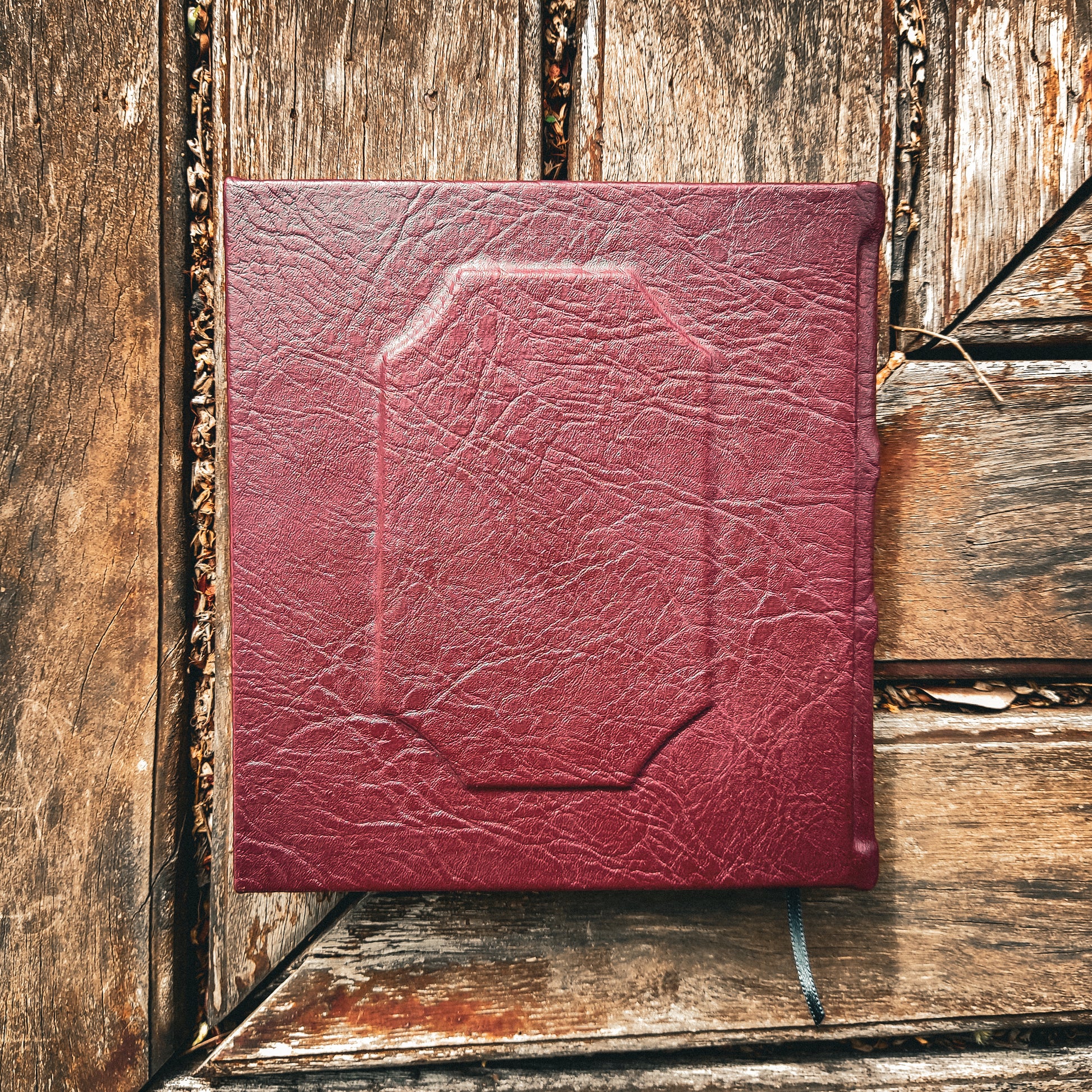 - Capa dura em cor marsala: revestida em sintético de alta qualidade com textura que imita pele animal.