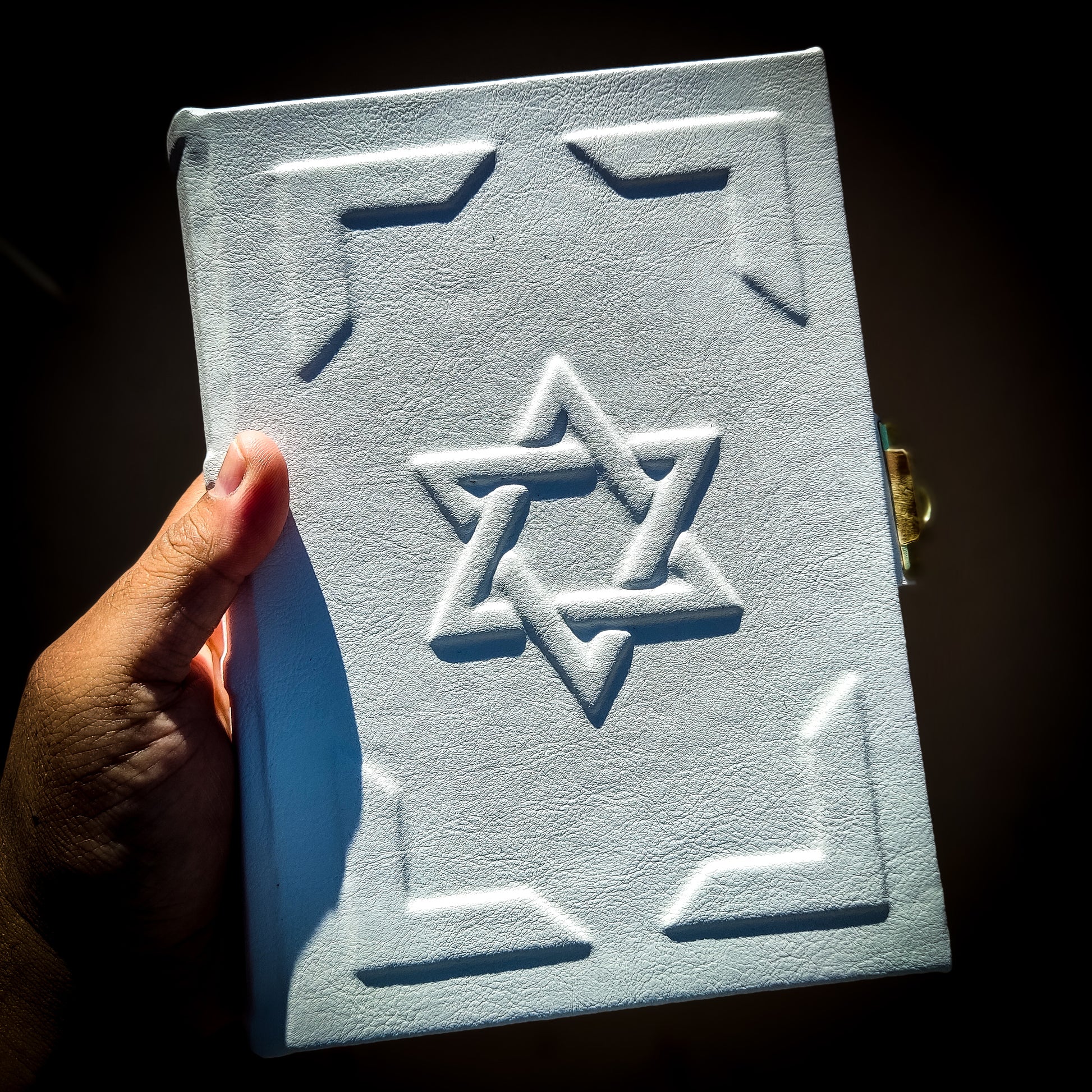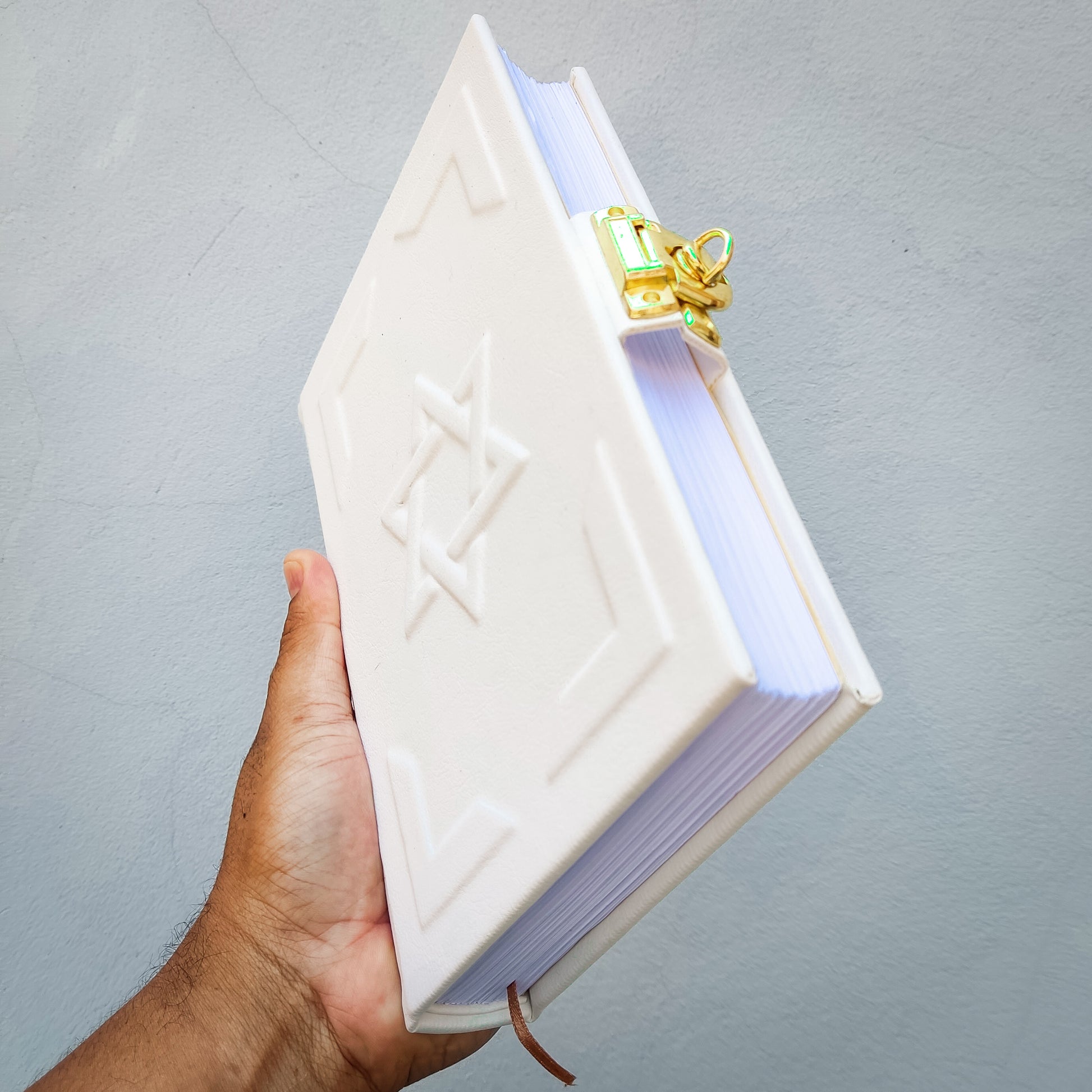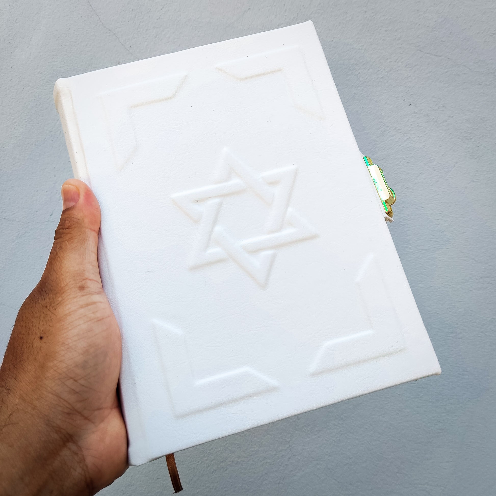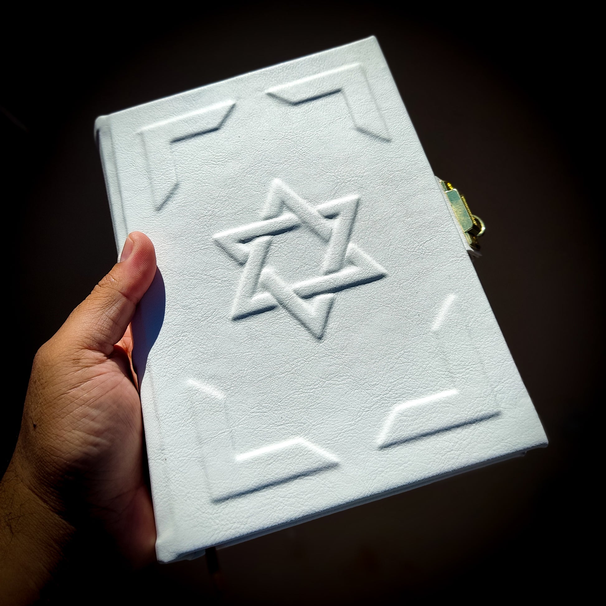 Com fecho metálico dourado e estrela central (estrela de Davi) em alto relevo.