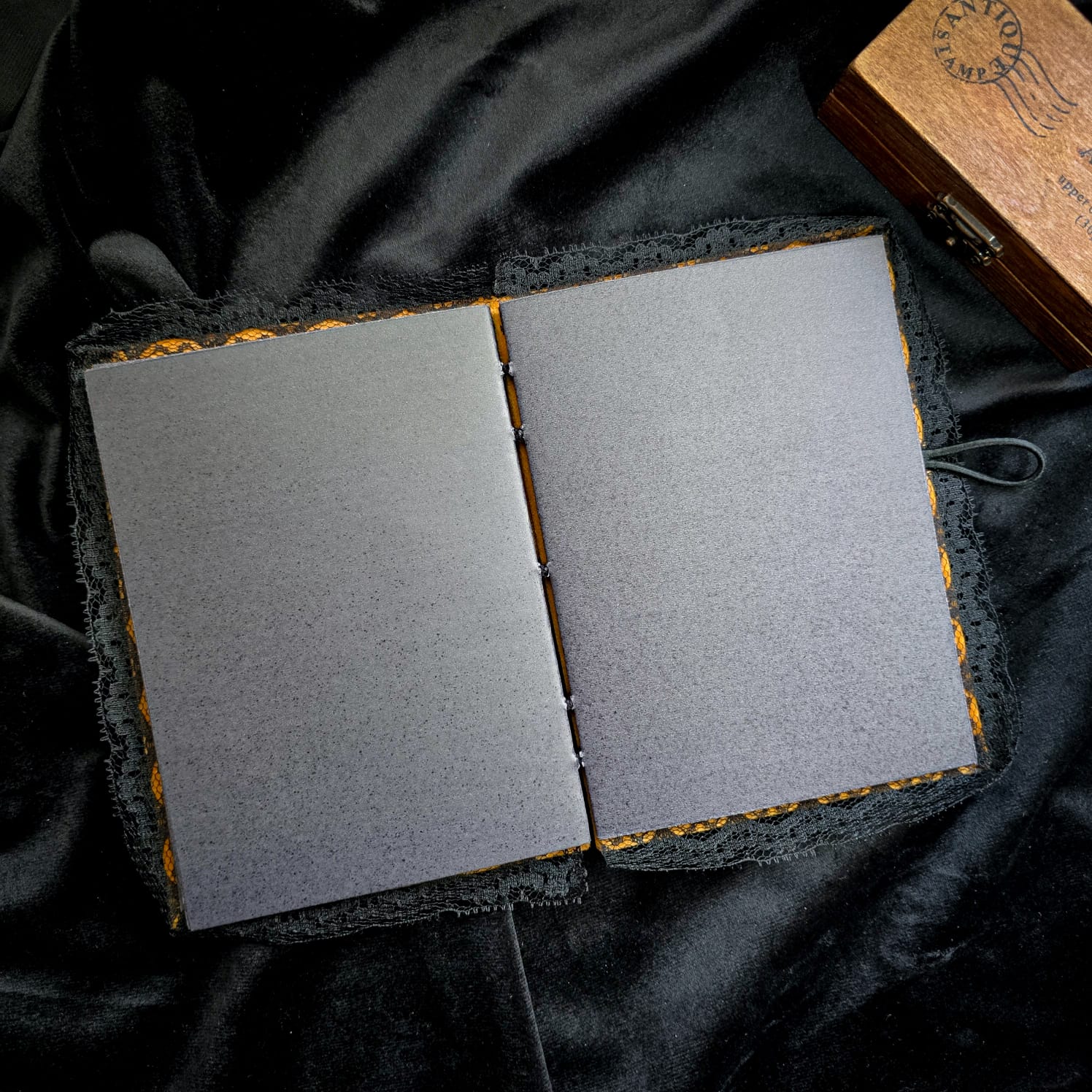 As bordas serrilhadas das páginas são como as sombras da noite, adicionando um toque de mistério e magia. Cada página é única, assim como suas próprias histórias e feitiços, criando uma experiência de escrita que transcende o ordinário.